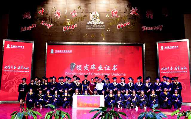 2018年6月15日,河南枫叶国际学校第三届高中毕业典礼在大礼堂隆重举行。原中共洛阳市委党校党委书记、常务副校长雷清、洛阳市教育局副局长贾长河、洛阳市社科联副主席蔡幼鹏、洛阳市新区建设投资有限责任公司副总经理刘玉茹、枫叶教育集团副总裁兼首席法务官范桂杰、河南枫叶国际学校总校长修海英、高中部加方课程校长Charles Richard Williamson等领导出席典礼。