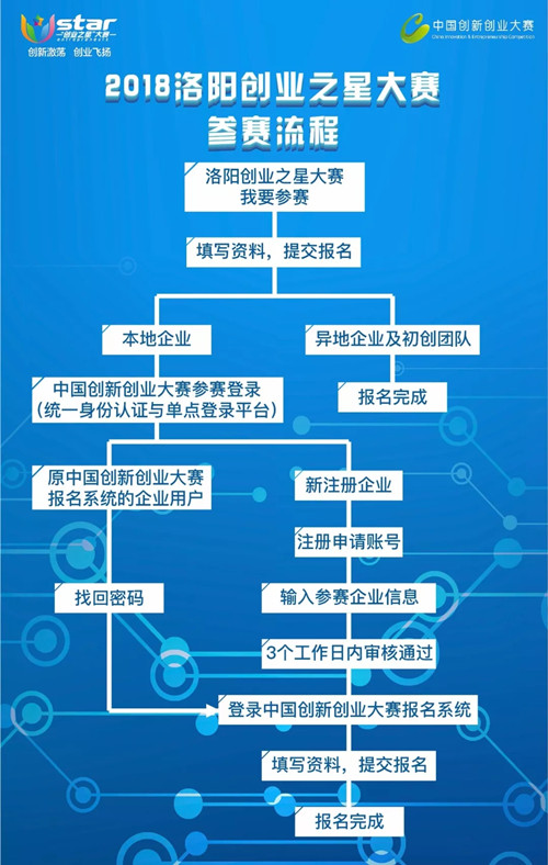 参赛企业团队请通过电脑端登陆洛阳创业之星大赛官网(网址:http://www.lhdz.gov.cn/star/)进行报名,大赛报名时间为5月10日至6月15日。由于洛阳创业之星大赛官网报名系统已全面更新,请往届参赛选手重新注册报名。根据第七届中国创新创业大赛的规定,初创组的初创团队只能报名参加2018洛阳创业之星大赛,并享受大赛奖金和其他支持,不具备推荐参加中国创新创业大赛河南赛区决赛和全国总决赛的资格。