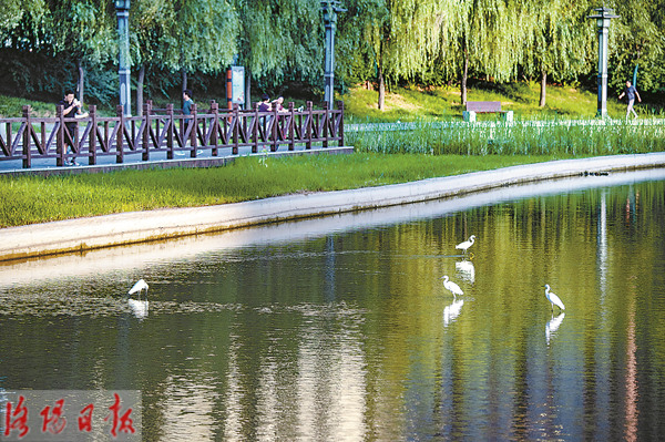 昨日清晨,在兴洛湖公园,市民晨练,白鹭嬉戏,构成了一幅人与自然和谐共生的美丽画卷。